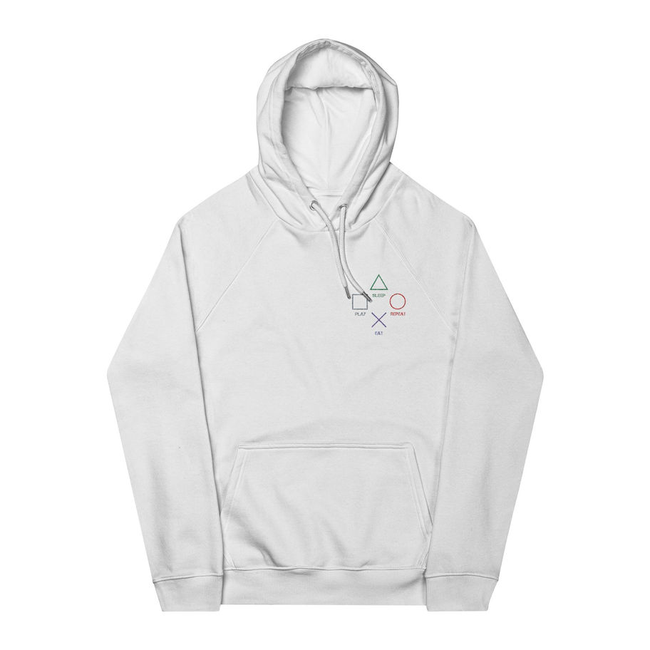 Soft, sustainable, and stitched with intention, this unisex hoodie blends laid-back comfort with clean gamer cred. The embroidered design playfully nods to the loop we all live by -- eat, play, sleep, repeat -- mapped in iconic shapes that all us gamers instantly recognize.